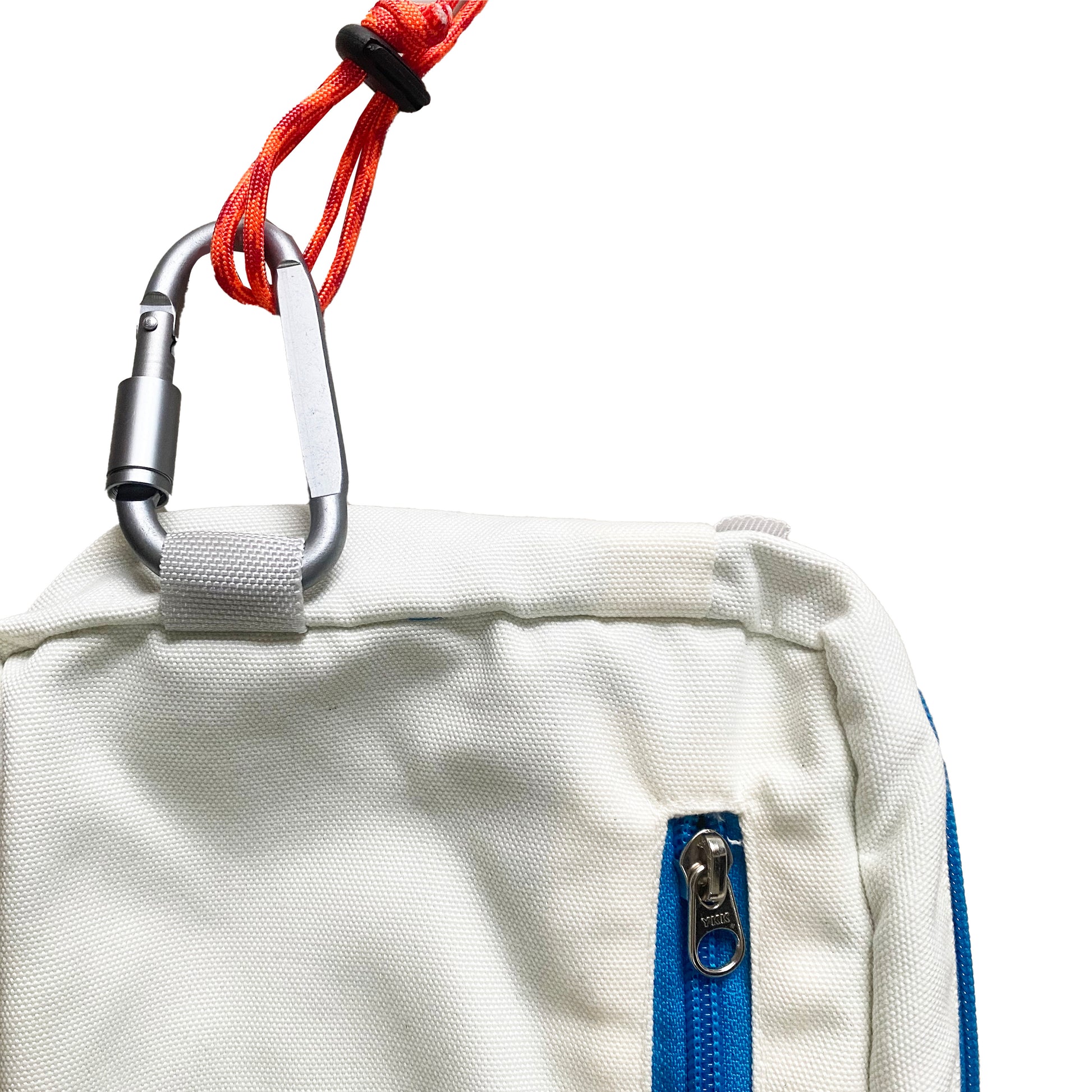 - adjustable paracord strap with premium metal carabiner - you can hook them into 4 spot options, as your preference on how this bag looks like